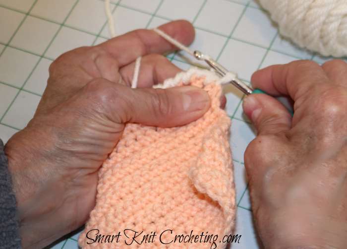 Attach a new color if desired and insert your hook from the front to the back. You will still be working the single crochet stitch, just moving in the opposite direction.
