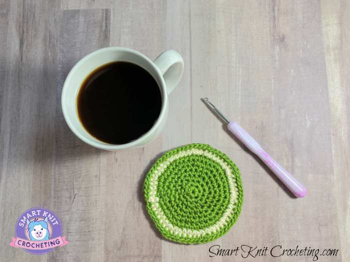 Continue for a larger circle in the same pattern increasing 8 stitches each round or fasten off and use as a coaster.