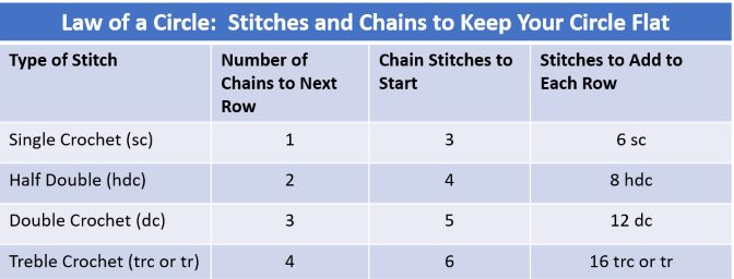 By following the chart above, if you want to make a circle using double crochet, you would chain 5 and connect with a slip stitch, then make 3 chains which also act as your first double crochet. You would then begin the circle with a set number of stitches say 8 and join with a slip stitch. Working the second round, you would need to add an additional 8 stitches making the total 16.