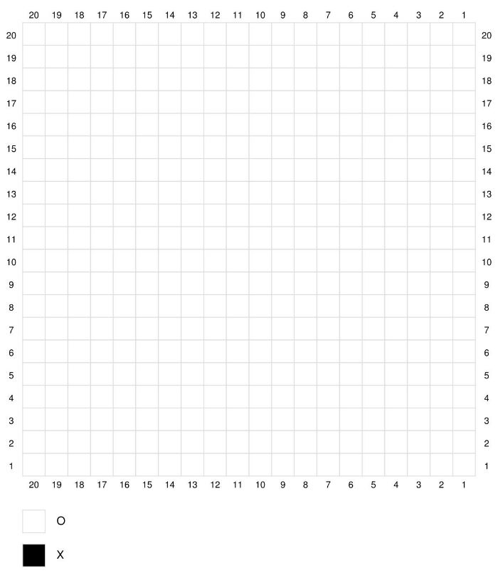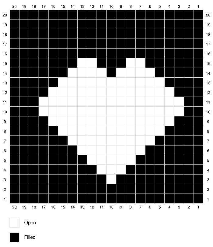 When designing your filet crochet patterns, you will want to start with an empty chart. The one above was made with Stitch Fiddle, but you can also use a spread sheet such as Excel to create the chart.
