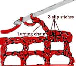 Instead of making a turning chain, work slip stitches across to where you wish to work the first mesh of the row. There are two slip stitches in space of chain 2 PLUS one slip stitch in every double crochet. Begin the mesh with a 3-chains out of the last slip stitch.