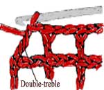 Form a triangle mesh similar to the one in case # 2. To make it, crochet a double treble crochet one mesh to the left in the row below. (Depending on tension of your thread you might will have to crochet a treble treble instead of treble crochet.).