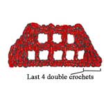 Decreases, to form a smooth edge of the crocheted fabric , can be done both at the beginning and at the end of the row. Pictures #2 and #3 in the table below demonstrate how to make decreases for the case of an opened mesh located at the edge. Picture #4 shows the way to decrease solid mesh at the beginning or at the end of row.