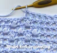 Draw the yarn through two loops on the hook completing the puff stitch. There is 1 loop on the hook. Each puff stitch takes place of one mesh in the filet crochet pattern.