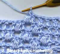 This time we will use a puff stitch, to decorate a filet crochet mesh. Each cell of a mesh consists of double crochet, chain 1, double crochet, (dc, ch1, dc). Let's substitute it by one puff stitch. Follow the steps below.