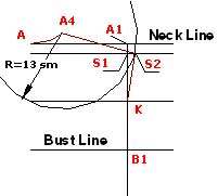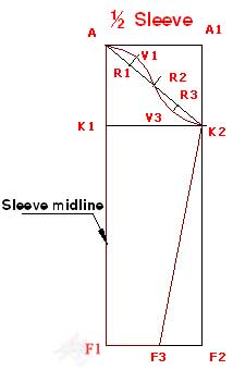 To finish the top part of the sleeve: Draw an auxiliary line AK2. Divide it into four equal segments: AR1, R1R2, R2R3, and R3K2. There are three points between the points A and K2: R1, R2, R3. Draw perpendicular lines to the segment AK2 at points R1 and R3.
